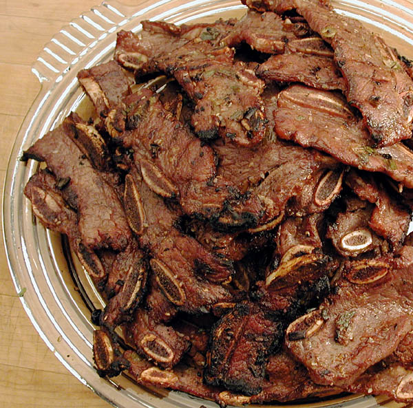 I put strips of meat into a large pan, and coated the strips with the marinade. When I was done coating the meat, I made it easier to handle and turn during the marinating, by sealing it in a FoodSaver vacuum bag, but a bowl or a Ziploc bag would have done just fine. I let it marinate for about 4 hours. The ribs were frozen, so they were defrosting as well as marinating on my kitchen counter. When it came time for the final cooking... I emptied the bag into a big bowl, and brought the meat out to the Kamado. I got the K up to about 700 degrees, and started laying the strips down on the grill (16" long Oxo tongs are a real joy to use in this situation). The smell was incredible. By the time I filled the grill with meat, it was almost time to start turning the first ones over, but I closed the lid for about another 30 seconds, for a total of about 90 seconds on the first side. I then turned them all over, and let them grill for about another minute on the second side. I removed the first batch to a platter, and started putting the second batch on, and repeated the process. It was dark out, and the lamp on my patio doesn't shine on the grill very well, so one of my sons stood there with a flashlight. As soon as all the meat was on the grill, I had my older son take the remaining marinade from the bowl, and simmer it in a small pot, to make some sauce for the jasmine rice that Lauren had prepared. A few minutes later I removed the second batch to the platter, and shut down the draft door and damper top on the now empty K, to bring the temperature down, because I wanted to dwell the meat for a few minutes more. After about 5 minutes, the K was down to about 400 degrees, so I heaped the entire batch of meat back onto the grill and closed the lid for another 4 minutes of baking time. When I brought the platter into the kitchen, I had some pretty anxious boys waiting (as they were outside with me for the cooking, and the aroma had them champing at the bit). Oh, to show how dedicated your humble reporter is... our little camera was very low on batteries, and it finally gave up right at the point where I was about to take a photo of the final results. So I ran across the street to the drugstore and replaced the battery, while my sons eyed the platter eagerly. Fortunately this round trip only took a few minutes. In addition to the rice, Lauren had a salad ready that was made from baby spinach leaves, with slivered almonds, mandarine oranges, and poppy seed dressing. This was a great success! You know that a meal is good when folk are full, yet can't resist picking at more pieces of meat. They said they weren't hungry any more, but still wanted the taste in their mouths. There were so many little bursts of flavor, a real treat. Friends..... this is a dish that will make your mouth happy! A follow-upSince I first composed this web page, I've made this dish several times. I even made it during a cooking demo at Tavern on the Green. I thought it was time to make a new photo of the finished meat, this time with a digital camera (the earlier photos were scanned in from prints) What you see on the plate is about 5 lbs. of delicious meat. Give this a try if you get a chance. If you have comments, please stop by our Guestbook.