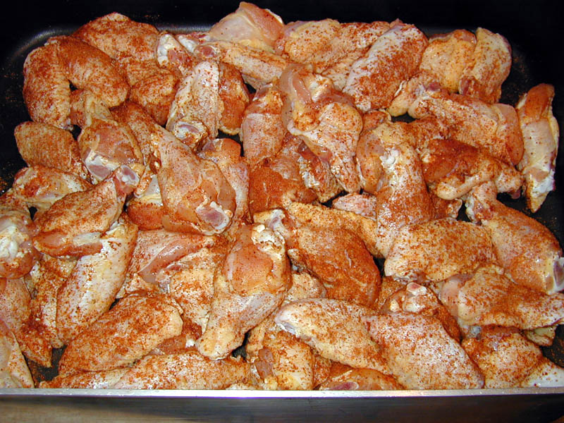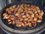 Grilled Chicken WingsThe aim of this meal is to produce chicken wings with crispy skin, yet still be very juicy inside. Click on the photos for larger images. The cooking technique is based on a recipe in Cooks Illustrated, but we used some of of JJ's rub instead of the simple black pepper that's called for in the recipe. We bought chicken wings in packages. A wing has three sections, the "drummette", the middle section, and the wing tip. We cut the three sections apart and disgarded the wing tips. Chicken wings really benefit from brining... it's amazing how much water they absorb and how many napkins you'll need when you eat them! We brined the wings for about 40 minutes in about a gallon of cold water with a cup of kosher salt (or 1/2 cup table salt) and a cup of sugar. The next step was to rinse the wings and let them dry (we used a collander, then some paper toweling). Next I sprinkled the chicken with some of JJ's rub. I use a shaker can to distribute the spices, it makes it easy to deal with. We tend to make batches of this rub and keep it around, so it's readily available in my kitchen. You could just as easily do salt and pepper and some garlic, and wind up with nice results. I fired up the Kamado, and brought the temperature to about 375 degrees. I used gas to preheat the cooker, then switched over to charcoal. I also tossed some wood chips that come from old wine barrels onto the fire (this gives a wonderful aroma and a subtle taste). Now it's time to put the chicken onto the grill... a pair of long tongs is very handy here! After about 6-8 minutes, it's time to turn the pieces over. Let another few minutes pass and turn again if necessary, taking off pieces that are done to your liking. Sometimes the drummettes take a few minutes longer than the middle section of the wings. This meal is a particular favorite with our sons. We recommend it for kids of all ages!