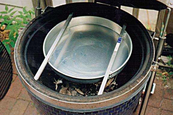 FabricationThe pan itself is a 16” aluminum deep dish pizza pan. Two short “U” shaped pan rails are affixed to the pan with 1” angle brackets. The rail and brackets are all fastened with 3/16” short pop-rivets. The rails are 1/4” “U” shaped aluminum channels available at most hardware stores. Two longer “U” shaped rails are placed into each of the pan rails and the entire assembly is lowered onto the grill ledge. The short rails hang from the long rails. There is enough clearance so that the pop-rivets that fasten the right angle brackets to the bottom of the short rails don’t touch the bottom of the long rail. Note that the long “U” rails are notched at each end so that there is minimal thickness between the grill and the grill ledge. The ends of the long rails are tapered, and the pan rides on the inside of the long rails, so there is no possibility of the rails separating, as they are captured by the ledge circumference. I experimented with the amount of expansion that might take place when the aluminum is heated, but so far I've not had any problems with buckling of the channel rods from an overly tight fit. Then again, I tend to use the drip pan with modest temperatures, under 400 degrees F. When pushed to the rearmost position, there is about 4” of access which is enough for me to see and mess with the coals. I’m considering adding an 18” pan to the options, I’d just need to attach some sort rails to the larger pan and use the same long rails. This would be for when no coal tending is called for. The materials costs were $9 pan, two 48” U channels @$4.79 each. Package of 4 1” angle brackets $2.50 and some short pop-rivets and washers ~$3.00 , for a total of about $25. The actual fabrication time was about 1 hour with simple tools (handheld electric drill, center punch, jigsaw, metal file and hacksaw.) So, why go through this extra work when there really isn’t much fire tending needed? For me, fussing with the coal and wood chunks is