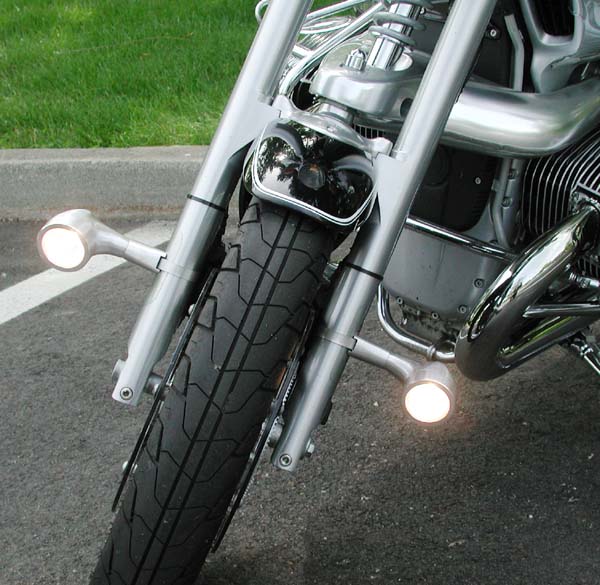 Shedding some light on the subjectWhen I got the motorcycle, one of the first things I wanted to do with it was make it more conspicuous by adding some additional lighting. I chose a set of brushed aluminum MotoLights that are mounted to the forks, about 14" off the ground. It took the dealer (BMWNY) 2 hours to install the lights. they did a nice job of routing the wires along paths uses by other electrical and hydraulic items. You can click on the small photos for larger images. The fixtures are machined out of aluminum billets and have a lifetime warranty (even on the halogen bulbs). There is a rocker switch that mounts near the left handgrip, and looks like it came with the bike. I'm surprised at how many people comment about these lights. They like the way they look, and the way the brushed aluminum finish complements the fork tubes. They also remark about how bright they are (compared to the headlight). When using the lights at night, I find that they light up the road nicely, and being low, they don't blind other drivers. I also like the idea that I'll never be mistaken for a car with a headlight out. The MotoLights, combined with the headlight make folk wonder what's coming at them (some strange UFO sighting perhaps). That's exactly what I want in a set of running lights. If you have comments, please visit the Guestbook. Copyright © 2001 by Zenreich Systems. All