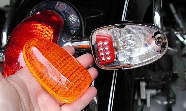 Shedding some more light on the subjectI like the idea of adding lighting to the motorcycle in an effort to make it more conspicuous. The taillight of the bike is a bit on the small side, so I added some Run-N-Lites Lite-Buddys with the optional Stop Light Alert feature. This is a pair of LED pods that sit inside the rear turn signals and serve as additional full time red rear running lights. The installation is pretty straightforward. You remove the turn signal lens and fish a thin black wire through the stalk, back into the taillight section. The LED pods come equipped with adhesive backing and piggy back electrical connectors. You simply disconnect the old spade connector, plug in the new connector and then plug the old spade onto the new one. There is no need to cut any wires, but a terminal crimper tool (or a pair of pliers) is necessary to connect one of the spades to the end of the wire that gets fished through the stalk) The LED pod fits nicely and you can route the wire up or down, depending on your mood. Although the LEDs are clear when they are turned off, they are bright red when powered up. They do show through the amber lenses, and display as bright red (my digital camera is very sensitive to the high infrared output of the LEDs so they show up as white in the photos here, but are red to the naked eye). I also connected the Stop Light Alert option, which hooks into the brake signal terminals in the taillight (it connects via a small module that lives in the taillight housing). This causes the LED's to flash a few times when the brakes are applied, then they revert to a steady on state. The StopAlert stops flashing a little sooner than my Kisan TailBlazer, so it makes a very visible combination. I decided that even though the red shows through the amber lenses, I wanted to see how it would look with the clear lenses (normally found on the Phoenix edition of the bike). The photo above shows the normal configuration: Amber lens with a clear bulb. This photos shows the new setup: Clear lens with amber bulb. The photo above shows one of each configuration (amber lens on the left)... just so show the difference with just the LiteBuddies lit. The photo above shows one of each configuration with the 4 way flashers on (so both the turn signals and LEDs are lit) Finally, here is the final clear lens configuration, all lit up. I like the way the new lenses look, the LEDs shine through quite brightly. I'm looking around to see if I can find brighter amber bulbs to make the directional signals more noticeable. Update: New Taillight assembly and BackOff frame.In an effort to increase conspicuity even more, two months later I purchased a BackOFF license plate frame from CycleGadgets. The frame has two rows of LEDs, dual intensity so they get brighter when the brake is applied. The photos below demonstrate the difference between the normal running lights and the brake. When I got the BackOff frame, I was a little concerned because the old style R1200C taillight assembly (the one visible in the Run-n-Lites photos at the top of this page) is a single piece cast piece comprised of the bezel and the license plate holder. I thought I was going to have to file out a bit of the top of the BackOFF frame to fit it onto the plate because of the curvature of the area where the bezel and plate come together. However, when I was about to do the machining, I noticed that my taillight bezel had cracked (for the third time), at the top left bolt (where it always did). This time, I was in luck... BMW has finally updated the taillight assembly. The new assembly is in several pieces, detaching the license plate frame from the taillight bezel. When I simply elongated the holes in the plastic plate holder. I gained the extra 1/8" or so necessary to mount the BackOFF frame without any modifications to the frame itself. Notice that the new bezel no longer has exposed bolts. Hopefully this will keep the bezel from cracking again. So now I'm very pleased with the lighting at the rear of the bike. Lots of bright lights, and blinky things going on! If you have comments, please visit the Guestbook. Copyright © 2002 by Zenreich Systems. All