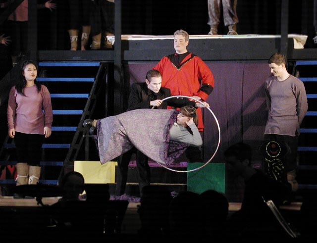 We've got magic to do, just for you...Scott and Joshua appeared in Pippin, the 2001 musical at the River Dell High School. The musical ran from March 30 to April 1 here in Oradell, NJ. Scott, a sophomore, was cast as "The Leading Player"... sort of a ringmaster for the play about the life and times of Pippin (the son of Charles the Great of France, circa 740 A.D.). This is the same role that Ben Vereen won a Tony for on Broadway. Joshua, a 6th grader was cast as "Theo", a small lovable boy, with his large lovable duck.