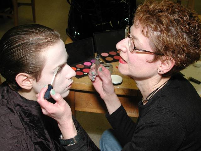 The pictures starting with the red vest were from Act 2. Over the course of the play, the wardrobe mistress kept replacing Scott's black outfit with progressively more red items. So during the intermission Ellen intensified Scott's makeup, adding glitter and generally making him look more evil.