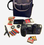 Click on the small photos for larger images. The case has a couple of small pockets inside that I use for compact flash cards and batteries. The attached "All Weather" cover tucks into a flap on the back of the case. I wound up using the cover on the way back home from the camera store on the very first day... very handy. The photo shows my typical compact kit (this entire bag gets put into a shoulder bag with my flash, bracket, TC-E2, etc, if I need more than just the basic camera essentials).