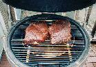 Pulled Pork ButtsPulled pork has quickly become a favorite around this household. It takes a while to cook, but boy, is it worth it. This page is the result of one of my earlier attempts at cooking pork butts. You can see a more ambitious cooking of 5 butts by clicking on the BBQ for a Crowd link. Two 8 lb. "Boston butts" at 10 p.m. The cut of meat is from the end of the shoulder of the pig (the "butt" of front leg). Set the fire to about 210-240 degrees, let the temperature stabilize and go to sleep. In the morning, check to make sure the temperature is still stable. After about 20 hours total cooking time, the meat looks like the photo above. Because I now have a sliding drip pan, I can cook the meat on the grill, without the need for a V-rack. When the meat is done (approximately 200 degrees internal temperature, as measured by a Polder style digital thermometer), I wrap it in foil and put it in a cooler (with no ice, of course) to let the meat rest. It's then shredded by pulling the meat apart with a couple of forks. We serve it with some North Carolina style vinegar based finishing sauce, or a South Carolina style mustard based sauce. Serve it on buns with a side of cole slaw and some baked beans, and you'll have some very happy mouths around the house.