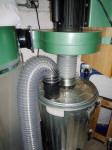 Harbor Freight Dust Collector with SeparatorWhen I expanded my basement shop into the adjacent room, I determined that it was preferable (and cheaper, especially with a sale price and a 20% off coupon) to add a HF dust collector to the new room, rather than try to duct a connection to the Delta 1.5HP canister unit in the 'lathe' room. The HF dust collector (DC) is a 2 HP 100 volt unit The DC comes with a 5 micron top bag, but I replaced the top bag with a 1 micron Delta bag that I also received when I got the Delta canister unit. I will eventually replace the bag with a cartridge filter. I also have air filtration units in each of the room to scrub any dust that doesn't make it into the dust collectors. Not satisfied to leave well enough alone, I also repositioned the dust collector's motor and added a separator. Instead of bolting the motor to the base of the DC, I opted to mount it onto a hinged plate attached to the wall. This has a few advantages: