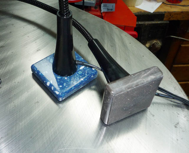 LED Task LightsIkea had these LED task lamps on sale for $9.99 (normally $39.99, such a deal!). The light output is respectable, and of good quality and color. First we got three to use around the house and to do some jewelry assembly. Because the LED lamps are very small and stay cool, they are a welcome relief from the very hot halogen lamps that we were using. When we started thinking about other uses, and the sale price, we returned and eventually acquired 15 of the lights (for immediate use, and to keep around for spare parts). Click on the small photos for larger images. The lamp comes flat packed, and consists of the lamp/gooseneck, base, and a small AC power supply. Around the shopIt became obvious that we didn't have to mount the lamp onto the heavy metal base, and that there were many ways that a bright LED could enhance our existing lighting and help while working on various shop machines. These photos show the light mounted on the machine, and a little detail of the mounts for each. The mounts all have two holes spaced 5/8" apart that mimic the mounting holes on the OEM bases. Metal posts at one end of the gooseneck normally slide through holes in the OEM base and are affixed with the supplied screws. It was actually kind of fun trying to figure out where these lamps should mount, and where to put the on/off switch Band saw and drill press: Scroll saw and grinder: Lathe: This is just one of the magnetic mounts we've made, shown here to demonstrate its use on a non-level steel surface. Magnetic basesMaking the base magnetic was a natural tweak for the light. The first attempt used eight 3/4" x 1/4" round magnets purchased from the local hardware store and epoxied onto the bottom of the base. The low power magnets were marginal, they couldn't support the heavy base well on vertical surfaces, so we looked for something better. The solution was 1/2" x 1/8" rare earth magnets. Only four of these powerful little magnets are required to secure the entire OEM assembly to a vertical surface. The while rectangles are 1/8" thick spacers to make sure it won't tip when used on a non-ferrous surface. That modification of the OEM base worked out well, and it doesn't depend on an iron surface. However, we wanted a smaller magnetic base that could be affixed to small areas of ferrous machines and tabletops. So we took some small pieces of Corian and created some small bases that we can easily move from machine to machine when we want a little extra light. For example, this can be easily affixed to the toolrest slide (banjo) of a wood lathe. Here are some of the construction progress photos Drill the holes: Glue in the magnets. We used a steel surface to make sure the magnets were flush with the Corian while the epoxy was curing. This way the epoxy conformed to the perfect magnet position. Finally, screw the lamp to the base, and cover the magnets (optional, but the lamps come with a thin adhesive rubber pad, so we gave it a try.) Hopefully others will find these photos useful. |