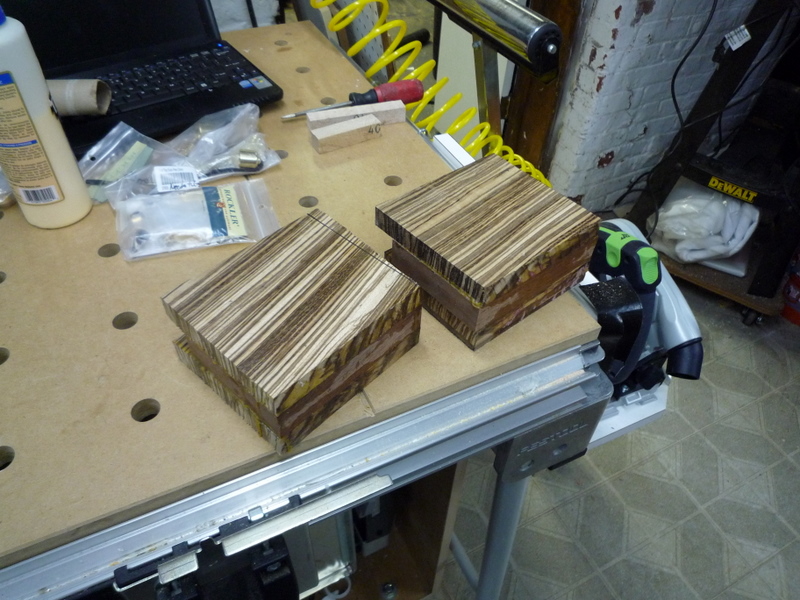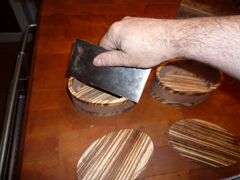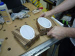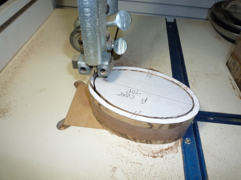 Oval Band Saw BoxesThis was my first attempt at creating boxes on the bandsaw. My mother asked for a small jewelry box to house a special watch. She saw a piece of zebrawood in my home and requested the box be made from that wood. I decided to make two, in case I messed one up. Fortunately, they both came out well. She has one, and I kept the box pictured above. Here are photos of the build process. I'll try to add some more detail later. Click on small images for larger photos. Glue up a sandwich of zebrawood and maple. One piece of zebrawood already had a thin piece of walnut glued on from another project... it gets cut off later. Attach oval paper template (made with Sketchup). On one blank, I aligned the template parallel to the grain pattern. The other was placed on a diagonal... just to be different. The template was attached with spray adhesive, and also covered with clear packing tape (a trick used by scrollsawers to help lubricate the blade) Cut out the oval blanks on bandsaw Sand the outer surfaces, label surfaces and slice off the top of each blank. Attaching the ovals to a rectangular block made the slicing easier. Attach new templates to the new top of the blanks. Cut out the core, then glue the entry point back together. Sand the hollow oval. Glue the bottom back on and sand to fit (because closing the entry point kerf changes the geometry slightly). Clamp the top on and sand to fit. Scrape off the template and smooth all surfaces. Slice the top off of the remaining core, this becomes the "bottom of the top" and insets into the box. Glue up the two pieces of the top. Now that pieces are assembled, apply boiled linseed oil to bring out the grain. Next I used some walnut wood filler to fill in the open pores. Then I used Tru-Oil Sealer, followed by several coats of Tru-Oil finish (light steel wool between coats). Tru-Oil is generally used for gunstocks, and I've used it before as a finish for the octave mandolin I built earlier this year. Here are some photos of one of the boxes. I kept this one for myself, the other went to my mother as a jewelry box for a special watch. I was going to apply flocking to the inside of the box, but she decided that it was too nice to cover up, so she'll likely add a piece of silk to protect the watch. |