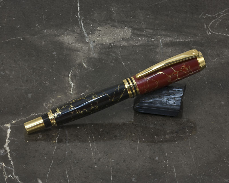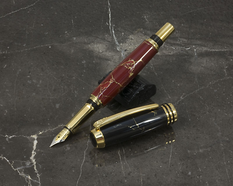 Tru -StoneThese are our first Tru-Stone pens. According to the supplier, Tru-Stone is manufactured from approximately 85% natural stone ore that has been pulverized to a powder and then mixed with pigments and acrylic resin. It is then compressed into blocks and cut to size. I turn these on the lathe using carbide tools, and then use MicroMesh and buffing to bring them to a very nice polished finish. I had to make some repairs to the top of the black/gold pen and also to the bottom of the red/gold pen. The repairs are visible only under a bright light through a magnifier, but I know they are there. So, I've made a red/gold top black/gold bottom hybrid of the perfect halves, and will keep the other halves as a reminder of how easy it is to mess up with this material (and how the repairs can be virtually invisible).