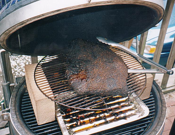 Smoked Corned Beef?For the last year or so, we've been making our own corned beef. This time I decided to try smoking one, attempting a pastrami-like creation. I took a 12 lb brisket and corned it with the dry rub technique found in Cook's Illustrated magazine. However, this time I let the corning occur in a vacuum sealed bag for the 6 days. Instructions for corning are found at our Corned Beef page. At 4 p.m. I washed off the corning rub, and coated the brisket with yellow mustard. I then ground a spice mixture that is mostly tellicherry pepper....with some coriander seed, celery seed, paprika, onion powder and garlic powder. I applied it with a shaker can to all sides of the meat. I brought the Kamado to about 220 in the dome. Some soaked cherry wood in an aluminum foil pouch went on the coals. Two fire bricks are supporting an 18" round Weber grill and the brisket is on that. Under the grid are two aluminum drip pans. I decided to leave the brisket on the K overnight... When I woke at 5 a.m. the temp had dropped to 160 degrees (it needed more fuel).... the internal temp of the meat was 165 by then. I got it back to 250 in a few minutes then took the meat off at 8 a.m. when it had reached 195 degrees internal. I guess it had been higher than the 165 earlier and was cooling down along with the K. I wrapped it in aluminum foil and let it rest for about 1/3 hour, then put it in the refrigerator, for reheating later in the evening. The results were very very good.... not quite a corned beef, not quite a pastrami...... best called a spicy smoked corned beef. We had guests drop by, and it was enjoyed by one and all. By the way, the uncooked weight of the brisket was 12 lbs, the final cooked weight was 8.5 lbs.... not too bad. Additional thoughts about smoked corned beef / pastramiIn the 70's, we used to live a couple of blocks from Pastrami King... and they made a very respectable pastrami sandwich. Now that we live in NJ, and do quite a bit of outdoor cooking, we make our own pastrami. Well, let me qualify that a bit. We make our own smoked corned beef (which, to my understanding, is fundamentally what a pastrami is.) The advantage we have is that we buy a full brisket (12-15lbs) and do a dry corning technique (found in Cook's Illustrated, from a couple of years ago) that takes about 7 days in the refrigerator. The reason I consider this an advantage is that I can start with great meat (usually prime grade) and control exactly what goes into the corning spices. I don't use any saltpeter or other nitrates/nitrites. An interesting side note is that the only reason corned beef is pink is that the consumers seem to demand it. The companies that make commercial corned beef have found that only New Englanders will buy brown colored corned beef, so that's the only place they sell it... everyone else gets saltpeter or other additives to make the meat pink. One the meat has corned for a week, I coat it with ground spices (black pepper, coriander seed, and/or whatever I'm in the mood for) and smoke it for about 18 hours at 225-250 degrees F. Because this is an entire brisket, both cuts are involved. The "first cut" (also called the "flat") is what you'll always see in the supermarket. It's lean, and tends to be dry if made from a commercial corned beef. The thicker "second cut" (also called the "point" or "deckel" cut) is fattier, and incredibly flavorful. Good Jewish delis usually make sandwiches that have slices from both the first and the second cuts, yielding a tasty sandwich. With all this talk about steaming a pastrami... I think folk are missing one of the great taste treats... eating a pastrami that has just come off the cooker (rather than one that's been steam reheated later). Another truly wonderful thing about smoking an entire corned beef brisket is that you can take the fattier slices from the second cut, and grill or pan fry them. You get something that has some of the same qualities/texture as bacon, and the crispy bits are amazing! So, the secret to great pastrami... in my opinion, is start with great meat, control the corning process, and smoke it slowly over low heat. You don't know what you're missing until you've tasted it.